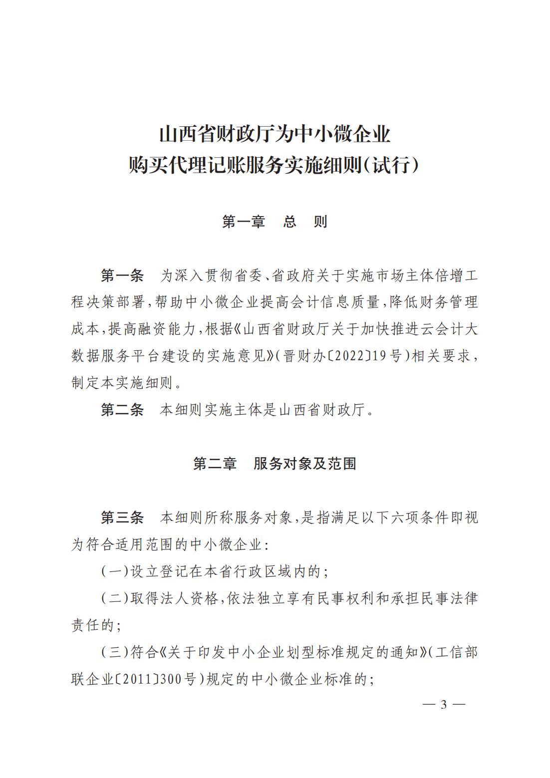 為進(jìn)一步支持全省中小微企業(yè)持續(xù)快速健康發(fā)展,切實(shí)加強(qiáng)和改進(jìn)會(huì)計(jì)服務(wù)能力,根據(jù)《山西省人民政府辦公廳關(guān)于印發(fā)強(qiáng)化市場主體倍增要素服務(wù)保障若干措施(試行)的通知》(晉政辦發(fā)〔2022〕7 號)、《山西省財(cái)政廳關(guān)于加快推進(jìn)云會(huì)計(jì)大數(shù)據(jù)服務(wù)平臺建設(shè)的實(shí)施意見》(晉財(cái)辦〔2022〕19 號)文件要求,省財(cái)政廳研究制定了《山西省財(cái)政廳為中小微企業(yè)購買代理記賬服務(wù)實(shí)施細(xì)則(試行)》,現(xiàn)予以印發(fā),請結(jié)合工作實(shí)際,認(rèn)真抓好貫徹落實(shí)。